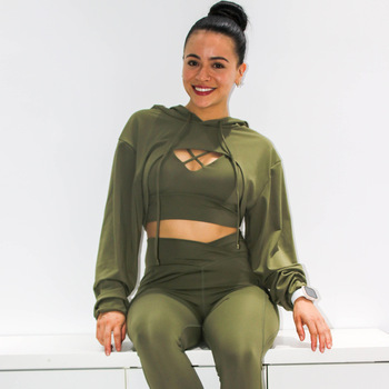 Özel logo 3 parça Set kadın Fitness Yoga giyim koşu kapüşonlu süveter kırpma üst egzersiz V bel tayt ve spor sutyen